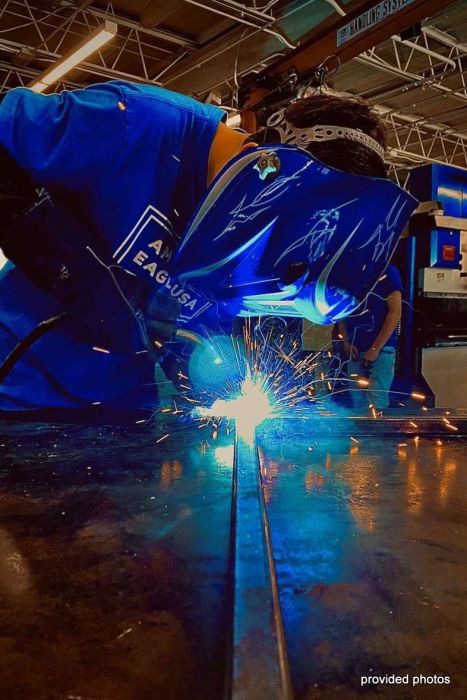 Evan McAllister welds a seam on one of the carts at McCann.