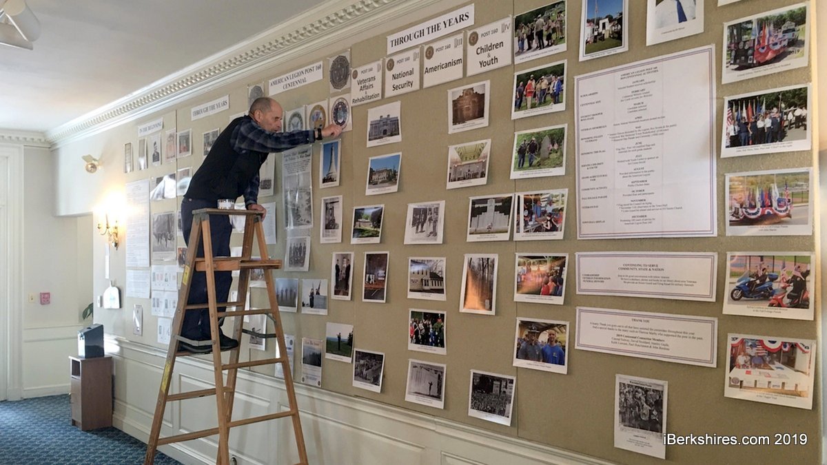 Conrad Sidway puts the finishing touches Tuesday morning on the exhibit at Town Hall showing the past 100 years of history of Adams American Legion Post 160.