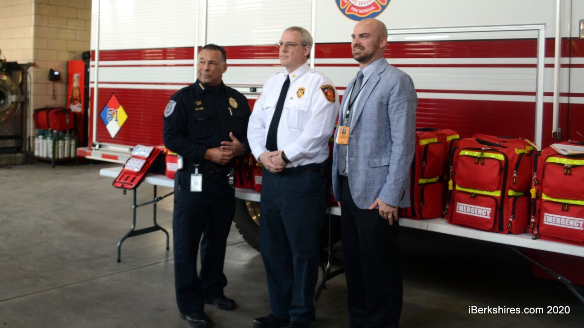 Fire Chief Thomas Sammons alongside Police Chief Michael Wynn and Eric Lamoureaux of the Pittsfield Public Schools announced Monday the delivery of 15 trauma kits that were secured through a Massachusetts Emergency Management Agency grant.