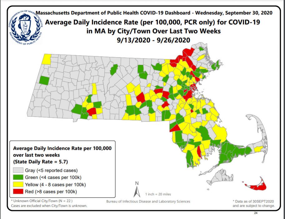 The county's numbers are fairly flat at 229 for the week ending Sept. 29 and 238 for this past week, for a total of 32,072. There has been one death in the Berkshires for a total of 414 and 90 statewide, for a total to date of 20,341.