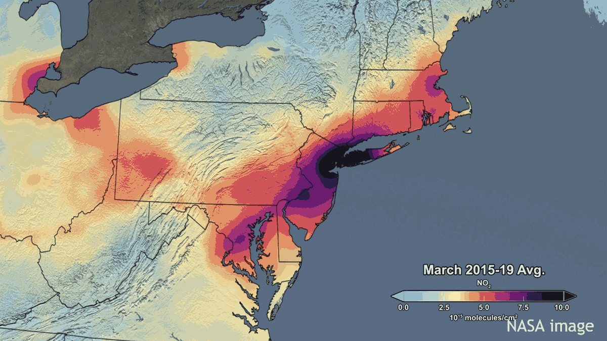 NASA data indicates a 30 percent drop in nitrogen dioxide, whose primary source is fossil fuel burning, in the I-95 corridor from Boston to Washington, D.C., when comparing March 2020 with the average for March from 2015-19.
