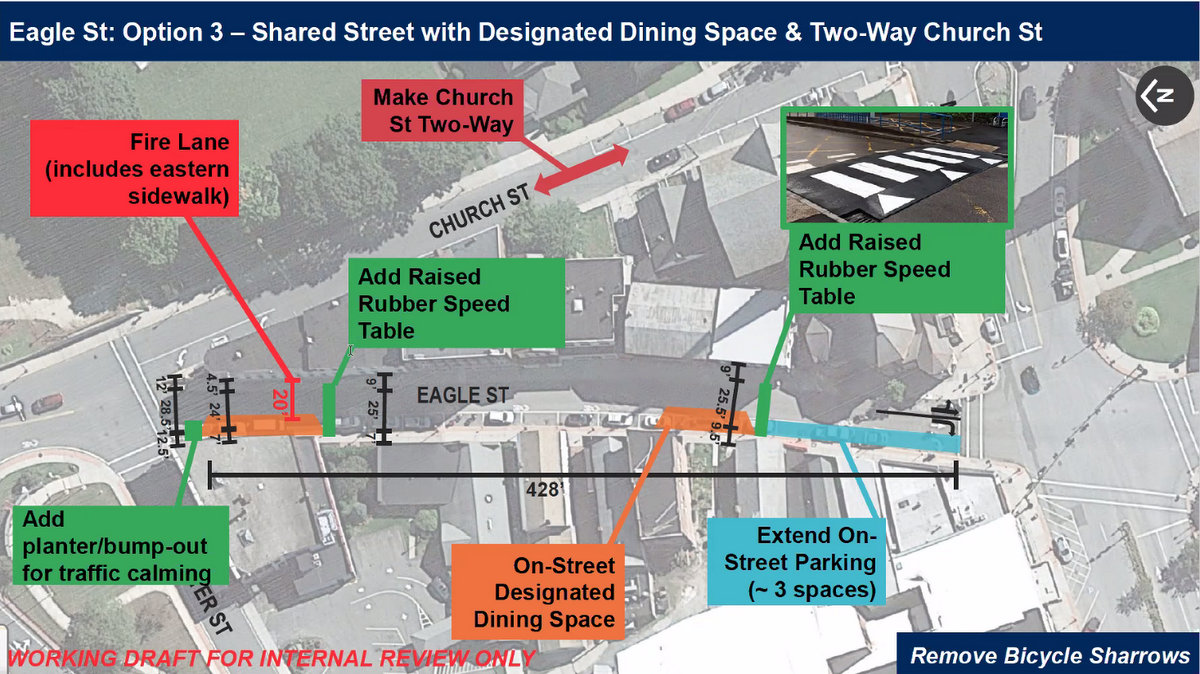 The discussion also turned, again, to the potential for closing off Eagle Street and turning it into a pedestrian way. The draft plans for outdoor dining included one modification of the woonerf plans that have been in consideration for more than a year. A woonerf would be a shared street with pedestrian and motor vehicle access; another option would be to revert north Church Street to two-way traffic.