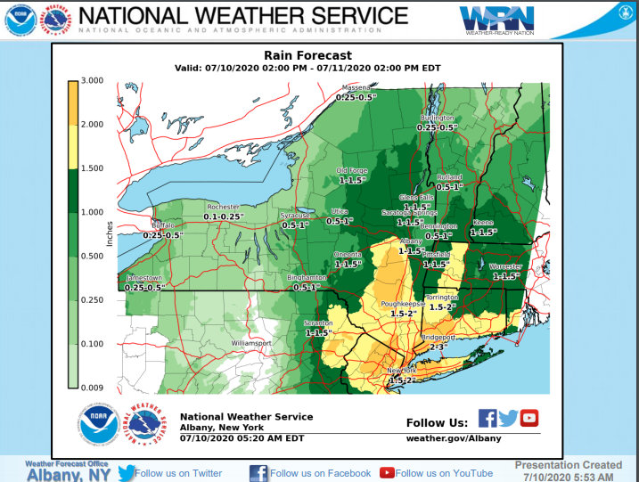 "While there is still some uncertainty regarding Fay’s exact track and the timing and placement of heaviest rainfall, confidence is increasing that high rainfall rates will present the potential for local flash flooding," according to NWS' latest weather briefing. "The eastern slopes of the Catskills and Helderbergs may receive some of the highest rainfall amounts."