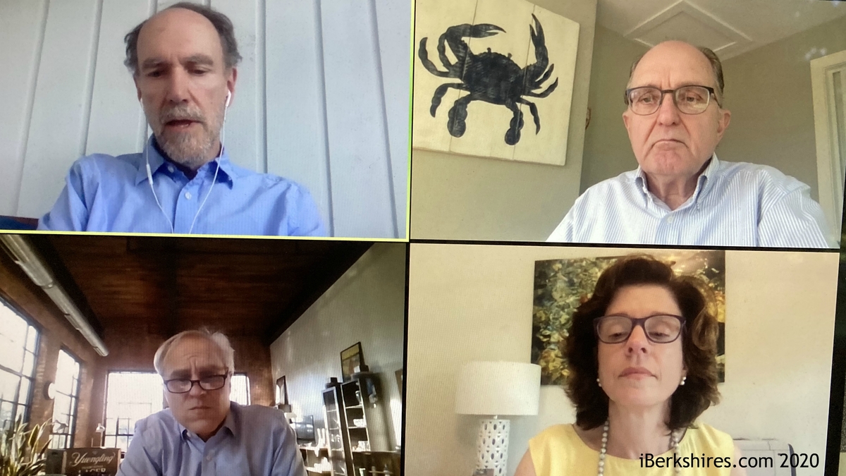 Williams College's Jim Kolesar, upper left, moderates Wednesday evening's forum with, clockwise, Vice President Fred Puddester, President Maud Mandel and Williamstown Town Manager Jason Hoch.