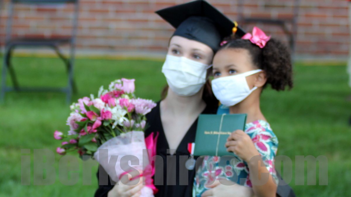 Seated apart below the school sign on the side lawn, they were ready to singly be called to pick up their diplomas and cheered by families and friends set apart in clustered seats of four.