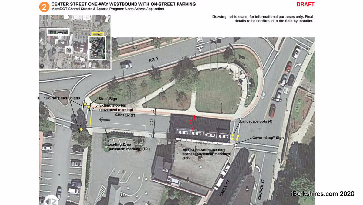 A portion of the eastern end of Center Street will be made one way to provide parking for Eagle Street and space for a loading zone. The western end of Center will remain as it is with access to the parking areas on each side of the currently closed off section being used by Grazie. Those sections will be made two way.