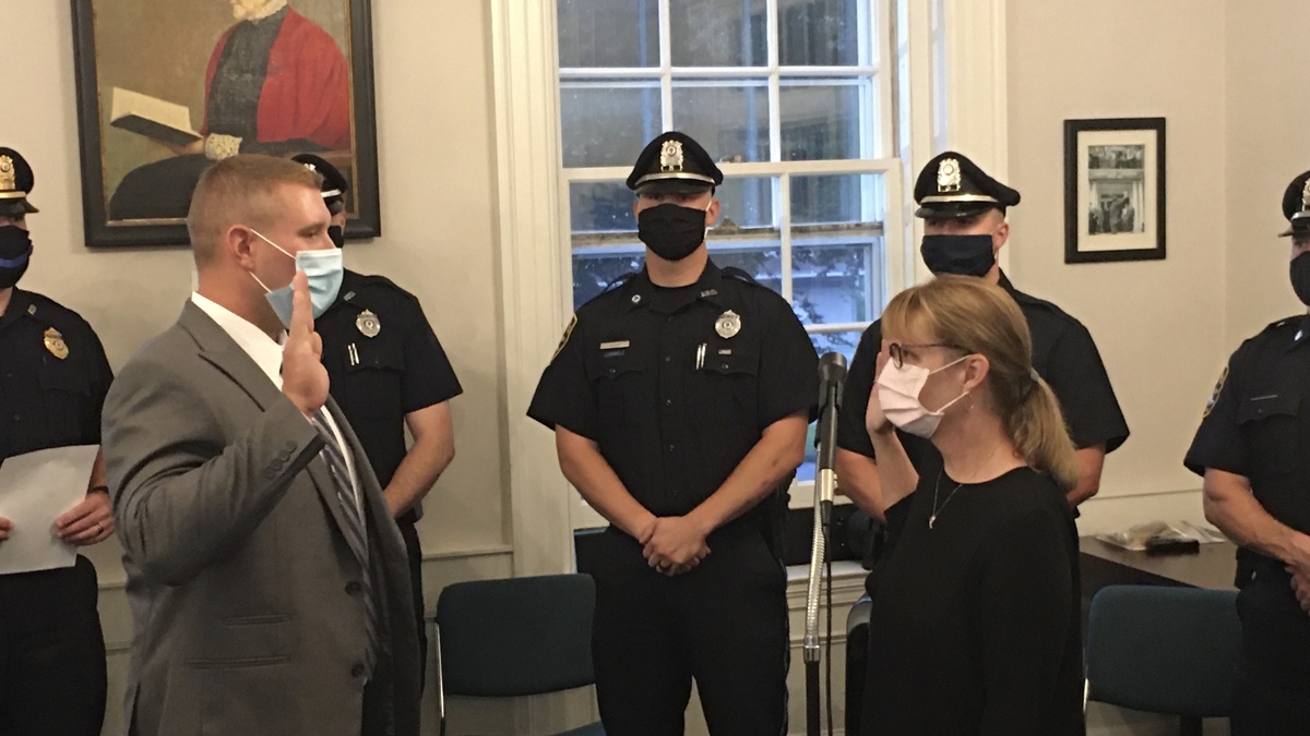 Two new police officers were sworn in in front of several of Adams' finest. Samantha Morin and Nicholas Kaiser took their oaths of office in front of their masked families and colleagues. The department has seen the retirement of several of its most senior members along with its chief in recent months. Interim Police Chief Troy Bacon praised both candidates' experience — Morin served in the Army and with U.S. Department of Homeland Security while Kaiser comes from the North Adams Police Department — and said they should have a smooth transition into the department.