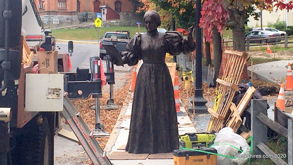 Susan B. Anthony, created by sculptor Brian Hanlon, awaits her pedestal on the Town Common. The unveiling of the statue was to be the culmination of a yearlong event celebrating the voting rights advocate and the 19th Amendment.