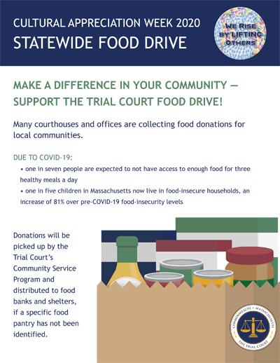 PITTSFIELD, Mass. — The Berkshire County courts and Pittsfield Community Corrections Center are hosting three separate weeklong food and supply drives to benefit non-profit agencies across the county as part of the Massachusetts Trial Court's statewide 4th annual Cultural Appreciation Week 2020, Oct. 19-23.