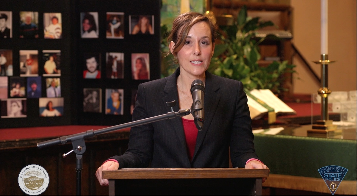 DA Andrea Harrington speaks during the recorded vigil.