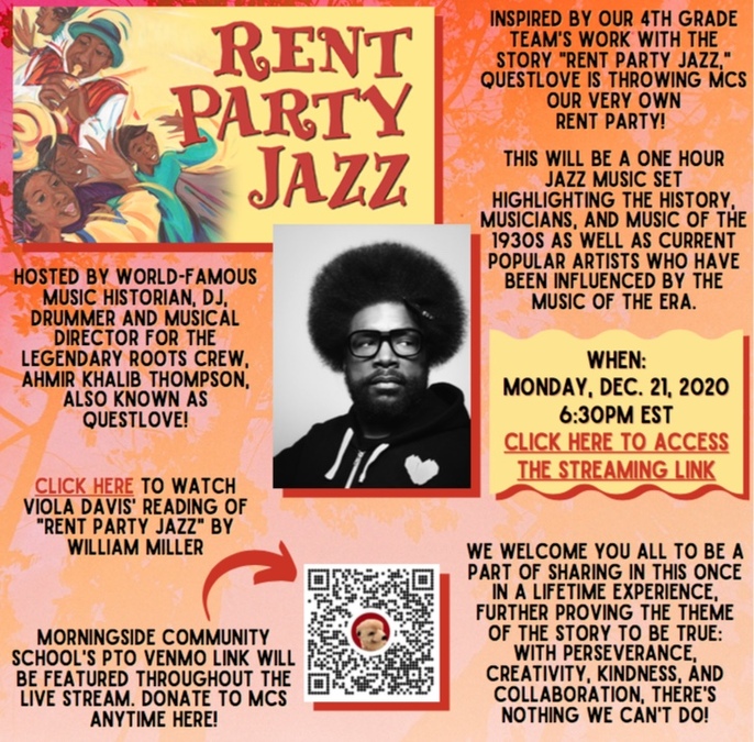 "Rent Party Jazz" included over an hour of jazz music mixed with Questlove's modern DJ style. During breaks, the artist would say things about Morningside School and a QR code that linked donors to the Morningside PTO's Venmo.