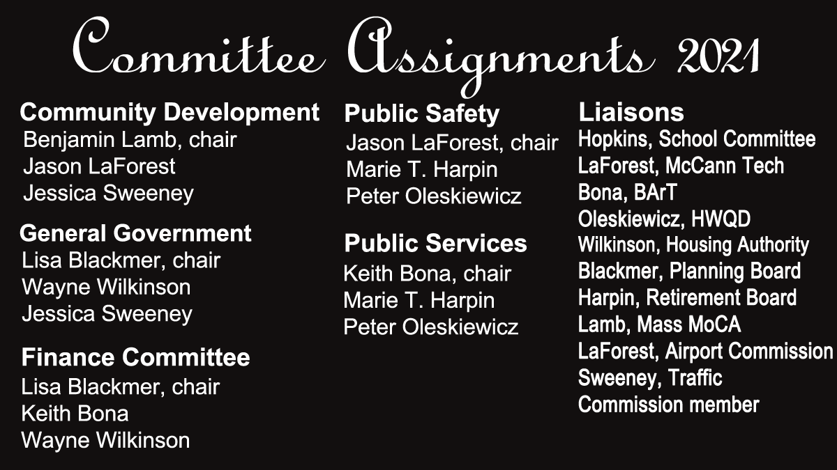 The conversation came up with the confirmation of reappointments to boards and commissions: Dean Bullett to the Airport Commission, for a term to expire March 1, 2024; Rebecca Choquette to the Human Services Commission, for a term to expire Feb. 1, 2024; Jason Moran to the Massachusetts Museum of Contemporary Art Cultural Development Commission, for a term to expire Feb. 1, 2024; and Kyle Hanlon and Brian Miksic to the Planning Board, with terms to expire Feb. 1, 2026.