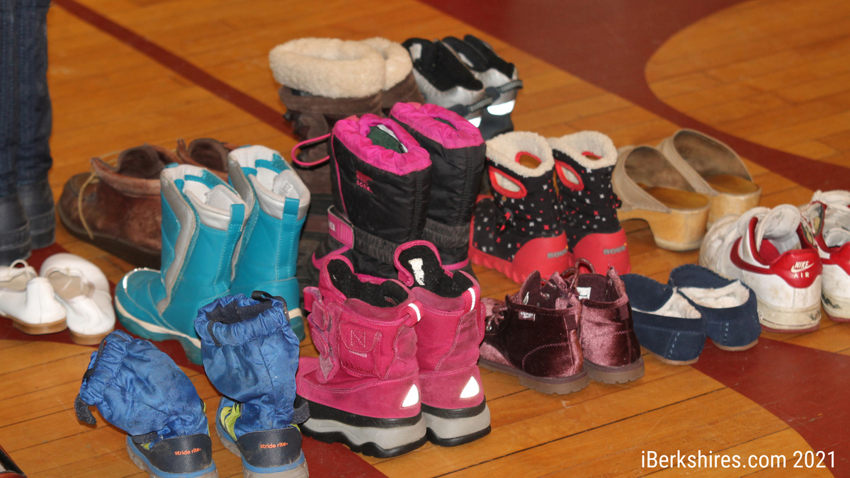 Boots and shoes lined up for clients of the Berkshire Immigrant Center. A Williams College intern is creating a website where the clothing and home wares can be viewed and selected, making it easier for those without access to transportation.Some of the items stored at St. Stephen's Episcopal Church.