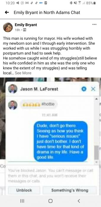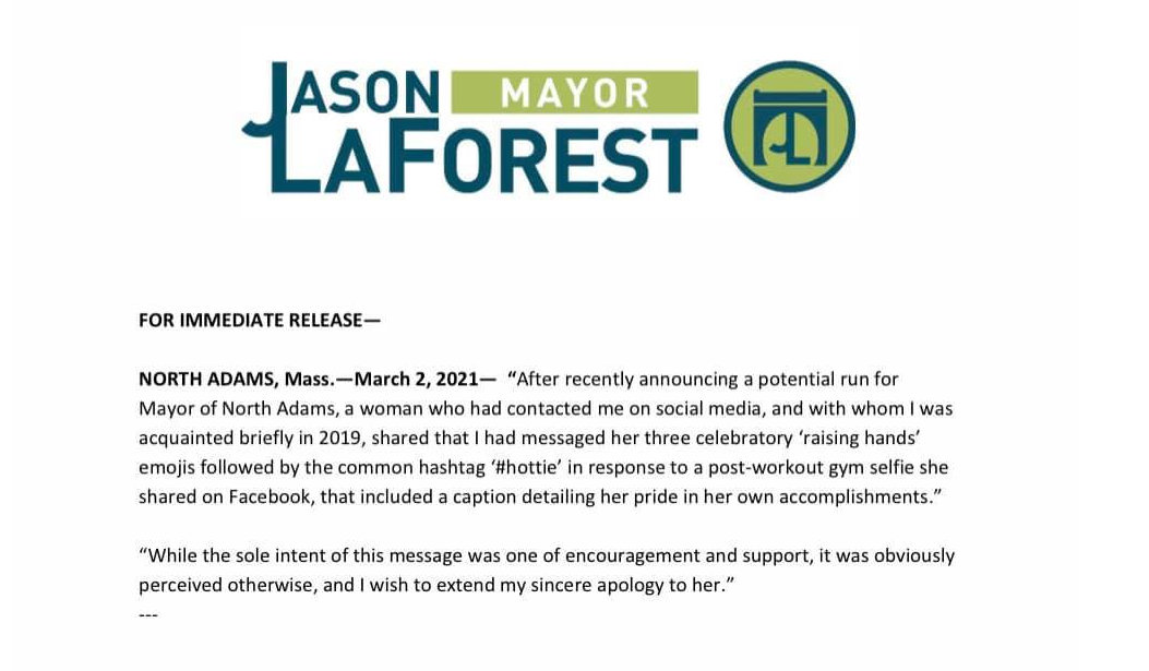 City Councilor Jason LaForest had sent Emily Bryant a text with clapping hands and the hashtag "hottie" in 2019. Bryant, who is married, posted the message and her response (which started with "Dude, don't go there ...") to the North Adams Chat group.