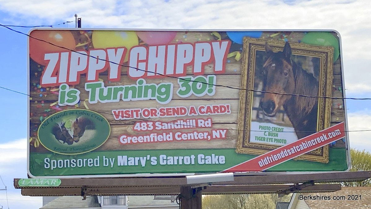 Richmond resident and sponsor of Zippy Chippy, Rosanne Frieri, facilitated (with Mary's Carrot Cake) some billboards in Pittsfield to wish him a happy birthday and is hosting a 147th Derby Party on Saturday, May 1, to benefit Old Friends farm, located not far from Saratoga.