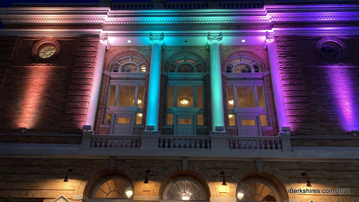 PITTSFIELD, Mass. — The Colonial Theatre was bathed in multiple hues on Wednesday night, as about 80 people gathered to celebrate the completion of Phase 1 of the public art installation by Berkshire Lightscapes.