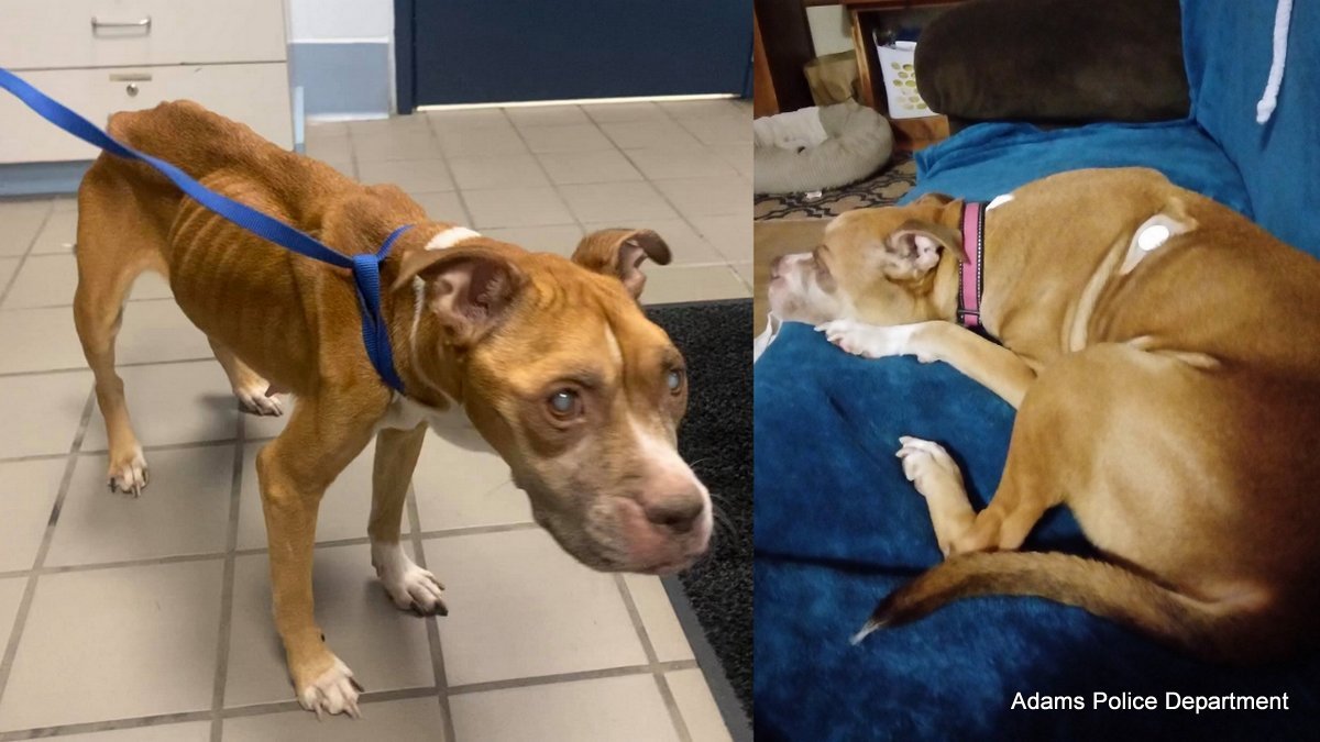 ADAMS, Mass. — A malnourished pit bull mix found by the Adams Police is doing better under the supervision of the Animal Control Officer.