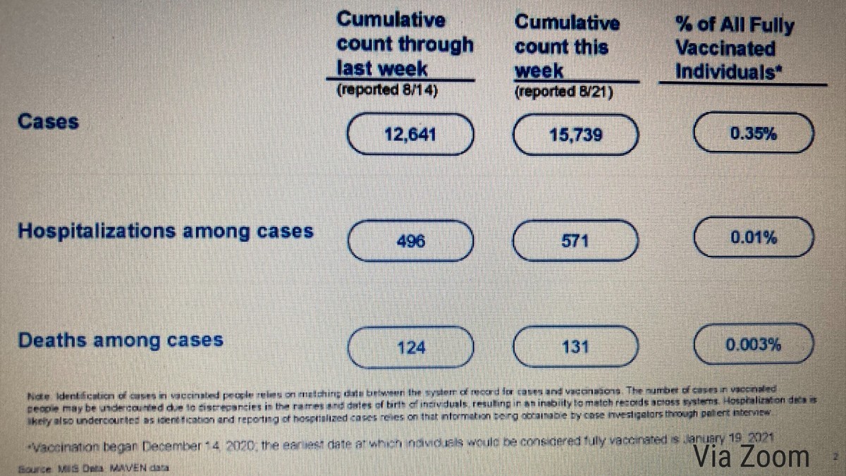 Lederer said that of the 4.49 million Bay Staters who are fully vaccinated, there have been 15,000 breakthrough infections — a 0.35 percent positivity rate. "We're seeing almost 20 times that rate in our unvaccinated population."