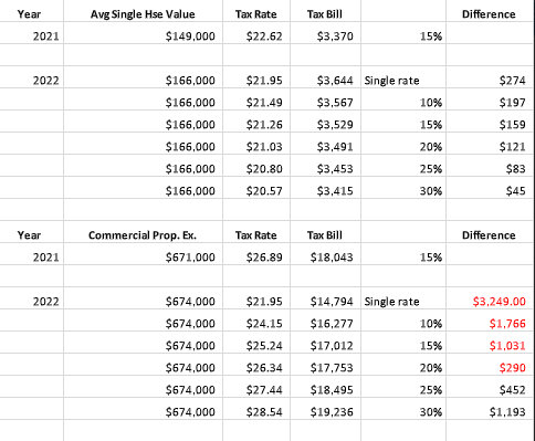 The figures are based on the value of an average single-family this year of $166,000, up from $149,000 last year. Getting an average business value is difficult because of a number of factors, so Wheeler pulled out one business, valued at $674,000, to use as an example.