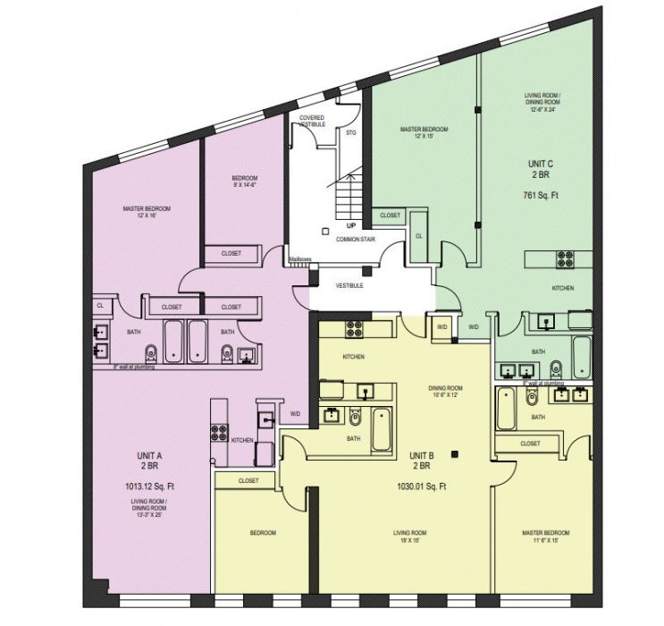 According to plans submitted to the Planning Board, the structure will have three apartments on each of the second and third level. Two will be two-bedroom units and the third will be one-bedroom. The two-bedrooms will be just over 1,000 square feet and the one-bedroom 761 square feet. The larger units will both have two full-bathrooms.