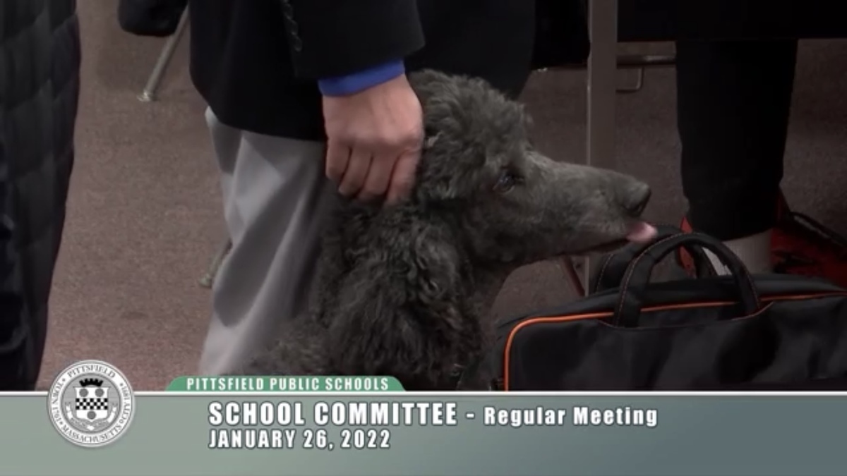 Molly the poodle attends Wednesday's presentation on a pilot comfort dog program for the Pittsfield Public Schools shown on Pittsfield Community Television.