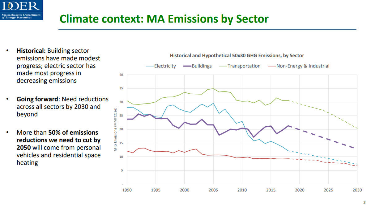 The new code must include "net-zero building performance standards, a definition of net-zero building designed to achieve MA GHG emission limits and sub-limits including a 50 percent GHG emissions reduction by 2030 from 1990 levels," according to state's updated energy code website. The electrical sector has made the greatest progress in reducing emissions over the past two decades and is projected to continue that decline.
