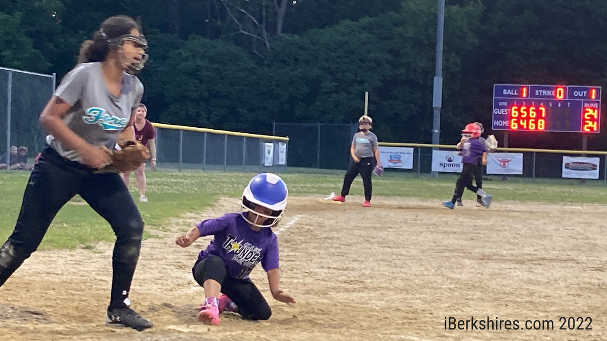NORTH ADAMS, Mass. – The Greylock Thunder 10-and-under softball team Tuesday outlasted the Berkshire Force for a 25-24 win in the semi-finals of the Berkshire County Softball playoffs at Alcombright Field.
