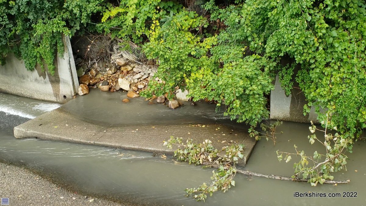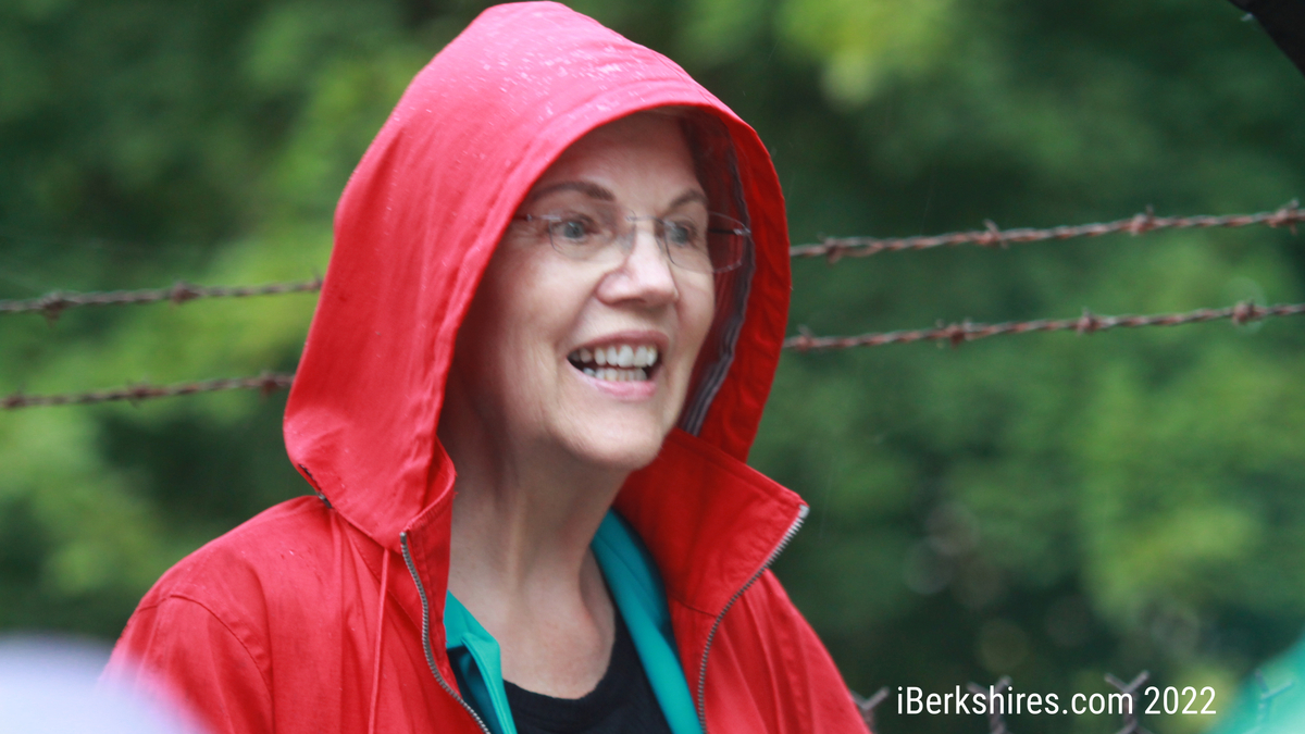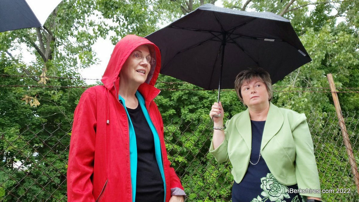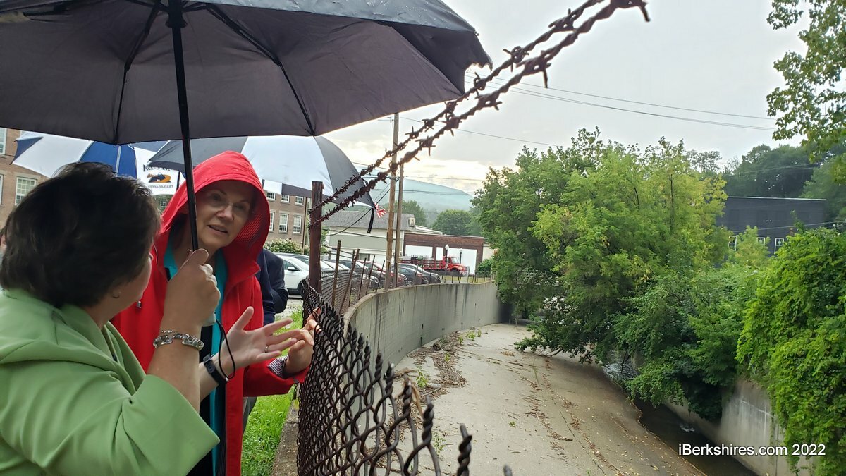 NORTH ADAMS, Mass. — U.S. Sen. Elizabeth Warren got a closeup view the "concrete scar" that runs through the center of North Adams. After standing in the rain to observe the collapsed panel at Willow Dell, she said she understood the need repairing or replacing the 70-year-old flood chutes.