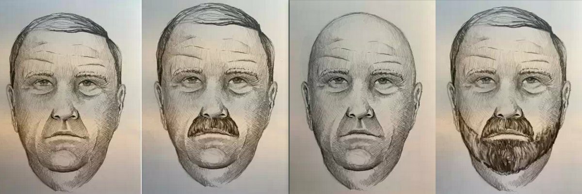 The artist aged up the suspect's face with variations of facial hair. He would be about 70 now.