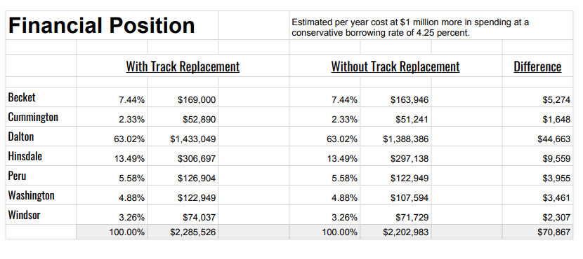 The total collective cost of the project per year between the seven towns would be $2,273,851 with the track and $2,202,984 without it.