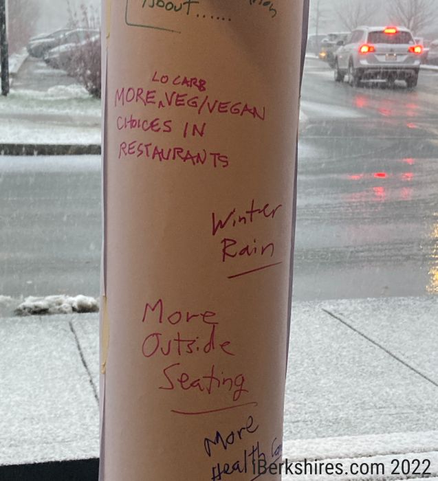 The results of Miller’s informal “pole poll” ranged from the universal, like “more healthcare” and “less disinformation about …” to the hyper-local, like “more outside seating” in Williamstown and a return of the swim requirement at Williams College.