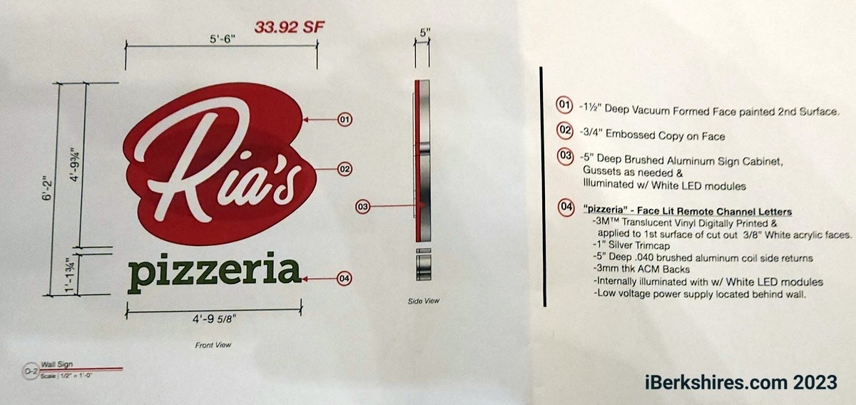The requested variance asks permission to install a 33.92 square-foot Ria's Pizzeria sign on the eastern side of the building. Two additional illuminated 5.83 square-foot signs for Ria's and Farmhouse Kitchen are also a part of the request.