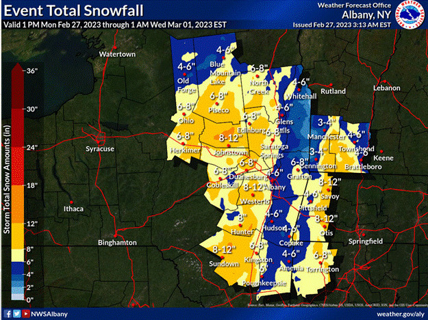 The National Weather Service in Albany, N.Y., has declared a 24-hour winter storm warning starting Monday, Feb. 27, at 7 p.m.