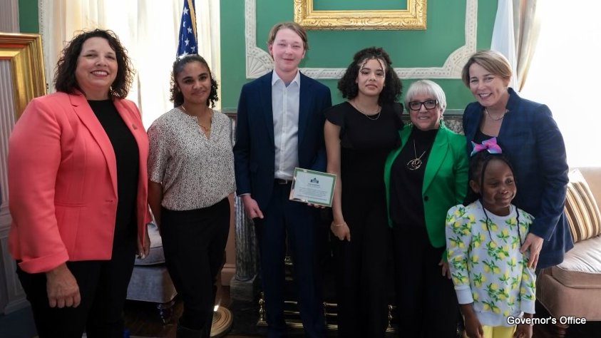 Gov. Maura Healey, right, with Julian Hynes, Ja'liyah Santiago and Adniley Velez whose essay on inspiration was chosen as the winner of the student essay contest.
