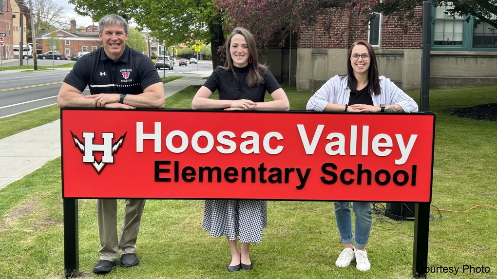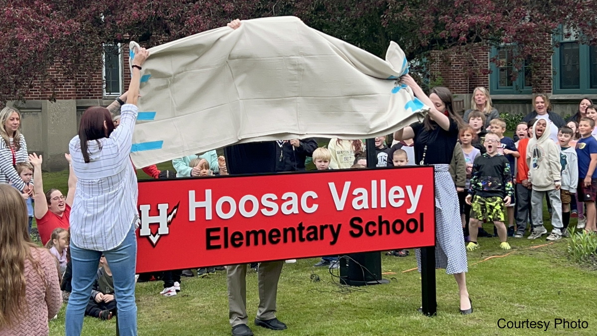 ADAMS, Mass. — On Friday morning the Hoosac Valley Elementary School community gathered on the school's lawn to welcome the school's first sign.