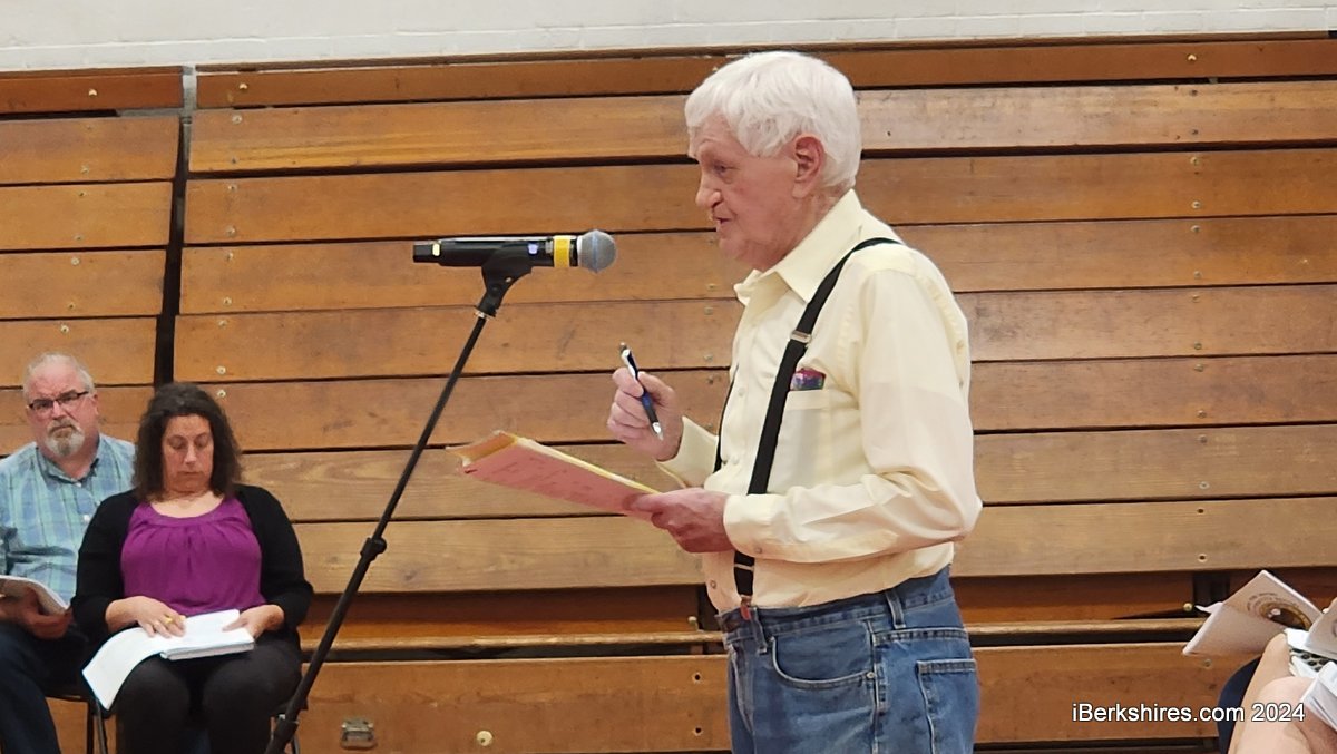 Cowie also pressed Hoosac Valley Superintendent Aaron Dean on the school budget and how the new pathways programs were helping educate the students. Twice a point of order was called that the questioning was off topic. Cowie tried to say it was about the budget but Town Moderator Myra Wilk said curriculum questions were best directed to the School Committee, not town meeting.