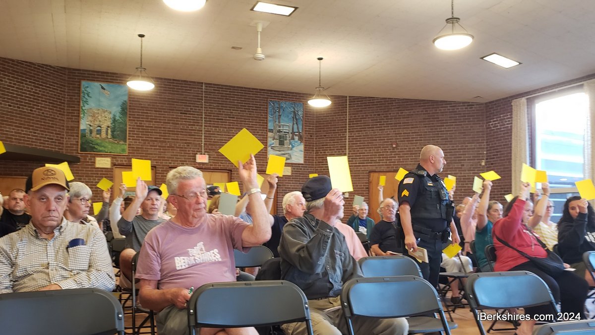 Voters were given a card with "yes" and "no" on it and instructed to tear it in half and put their vote in the box and the other piece in the trash. It took only a few moments to vote and count the ballots and Moderator Carol Francesconi read out the results.