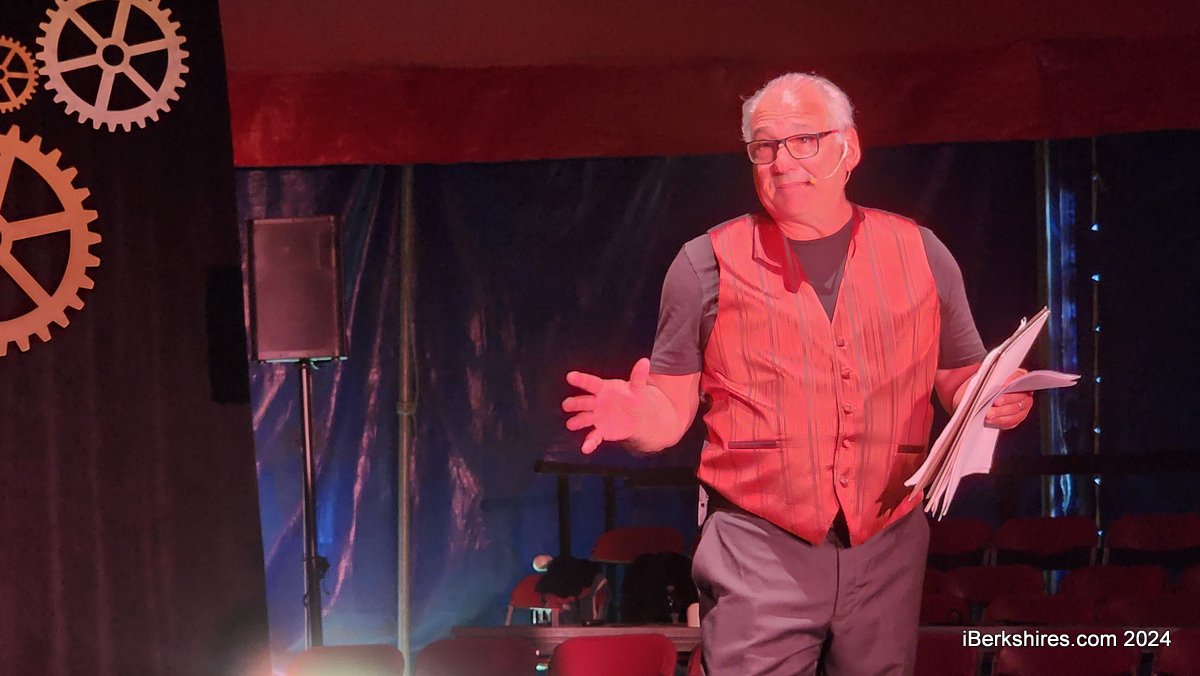 Carlo Pellegrini takes on the role of ringmaster, storyteller and mill boss as North Adams' history is revealed through acrobatics.