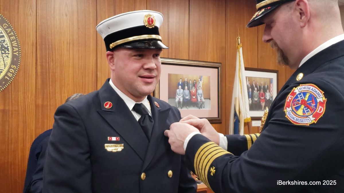 Shaun F. Hayden is sworn in as lieutenant in the North Adams Fire Department at Tuesday night's City Council meeting. City Clerk Tina Leonesio swears in Hayden, who is accompanied by Fire Chief Brent Lefebvre, right, and Deputy Chief Robert Patenaude.