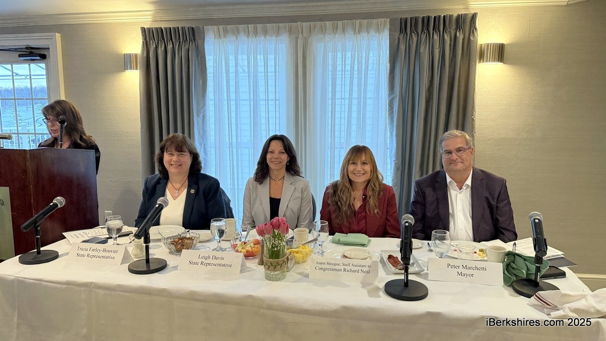 State Reps. Tricia Farley-Bouvier, left, and Leigh Davis, Joann Shugrue from Congressman Neal's office and Pittsfield Mayor Peter Marchetti attend the annual advocacy breakfast at the Country Club of Pittsfield on Friday.