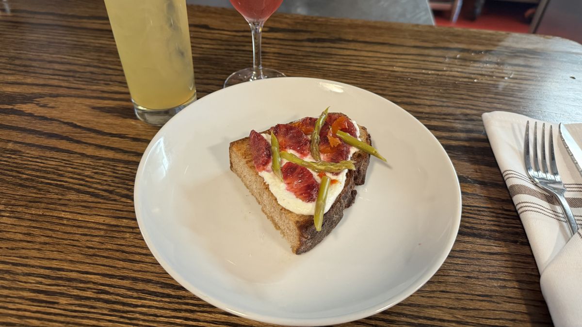 Ryan says two of his favorite dishes right now are the chickpea panisse made with garlic chili crunch, green garlic chimichurri, and a sunnyside egg along with the orange toast made with Berkshire Mountain Bakery miche sourdough, honey sumac ricotta, pickled asparagus, and calabrian chili.