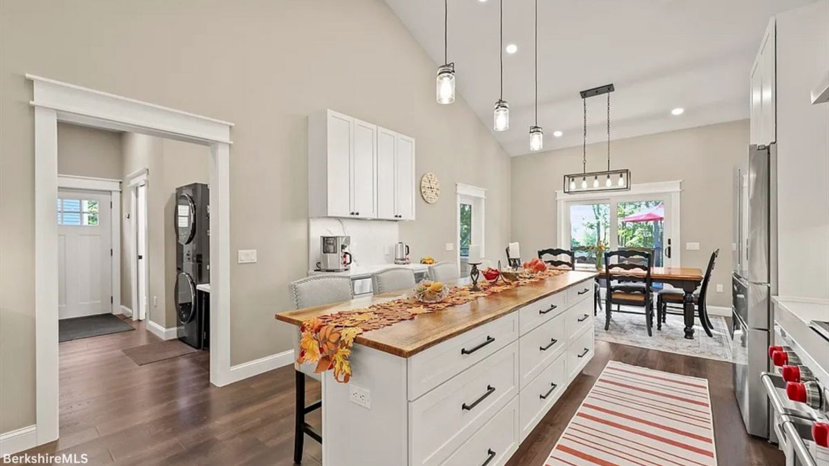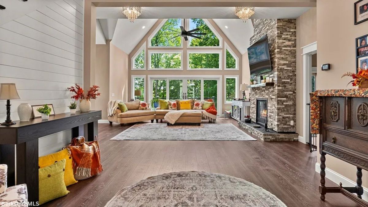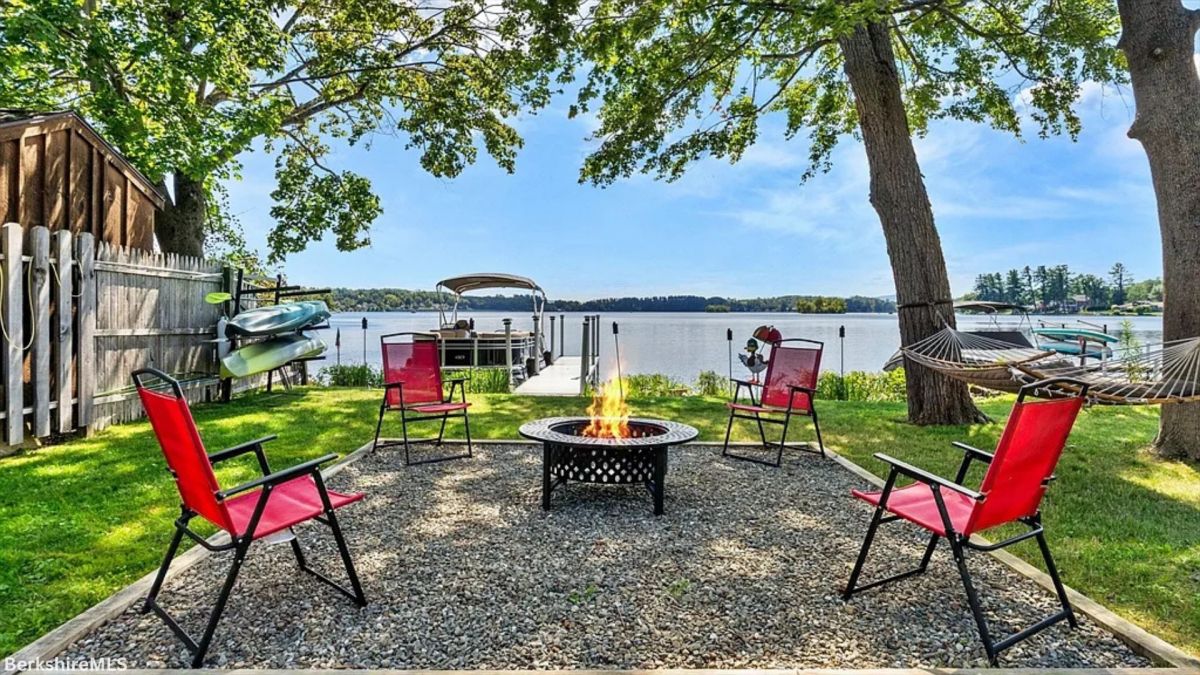 The house also comes with a 1,600 square foot two-car garage and includes a private dock for access to Pontoosuc Lake, accompanied by a fireplace to enjoy by the water.