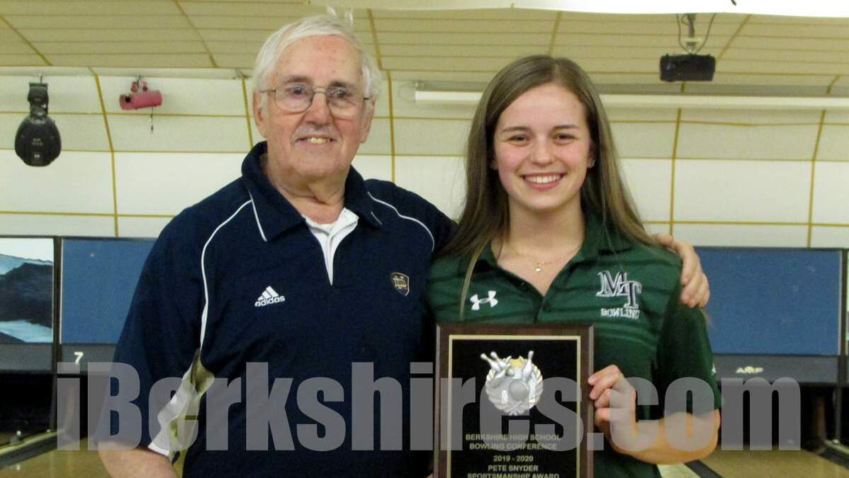 Aleasia Yeaton of McCann Tech, a member of the Berkshire County High School Bowling Hall of Fame's inaugural class, is seen with coach and league official Lou Orazio at Senior Night in February 2020.