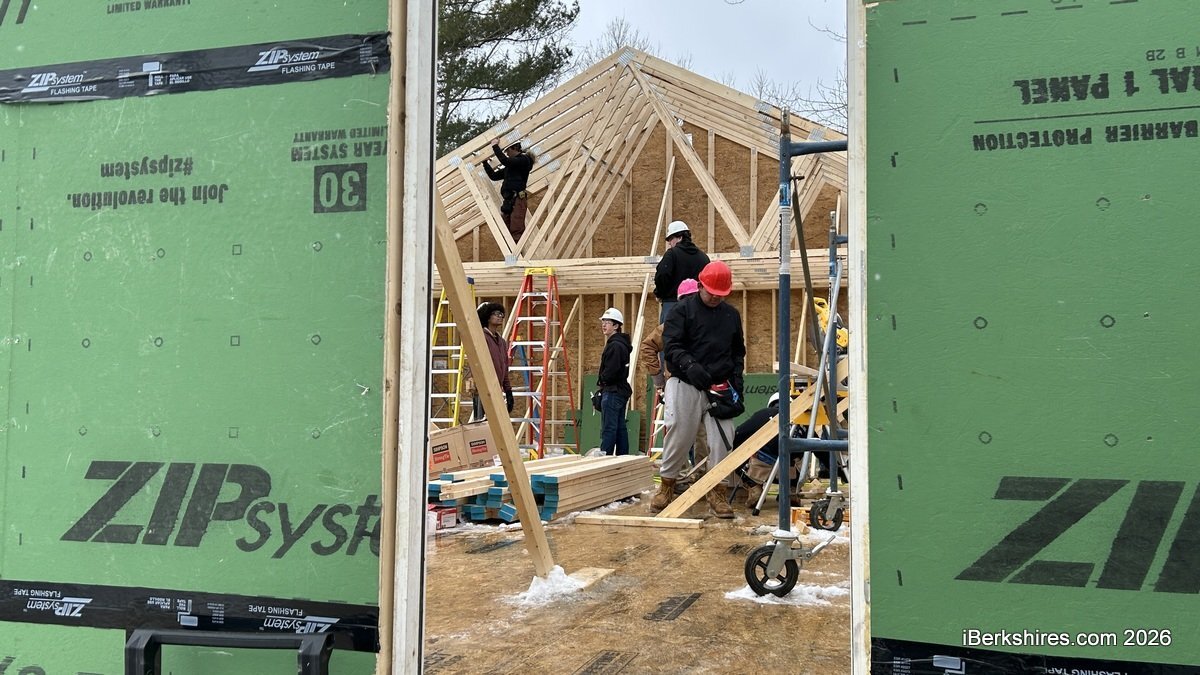 On Thursday, roof trusses were set on the home that Taconic High School students are partnering with Central Berkshire Habitat for Humanity to build. This is one of several homes the nonprofit housing organization has recently built, but a first for the young, skilled trades workers who were involved from the concrete pouring in October 2025.