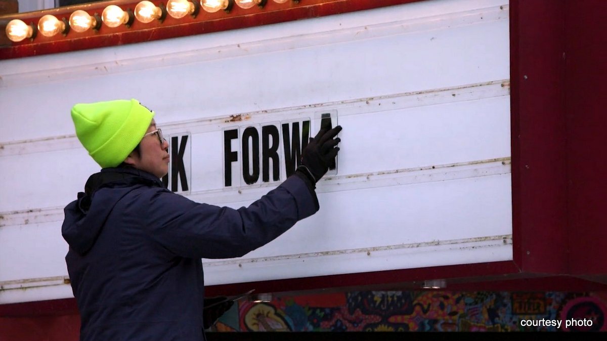 Janet Curran replaces the lettering on the Images Cinema sign in this provided photo. Curran, who's been at the nonprofit for more than 20 years, was let go when her post as managing director was eliminated last fall.