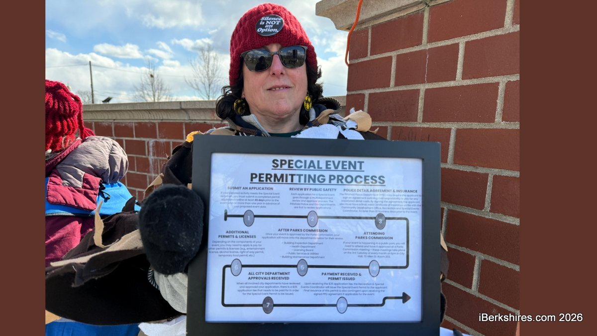 No Kings rally emcee Sonya Bykofsky displays the permitting process required by Pittsfield. The city at first requested insurance coverage for the special event permit but the issue was resolved months before the First Amendment rally.